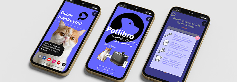This mobile-first application, featuring Oscar the cat, demonstrates best practices for cleaning a PetLibro pet water fountain. It combines short instructional videos, step-by-step guidance, and a simple knowledge check to reinforce proper maintenance techniques.